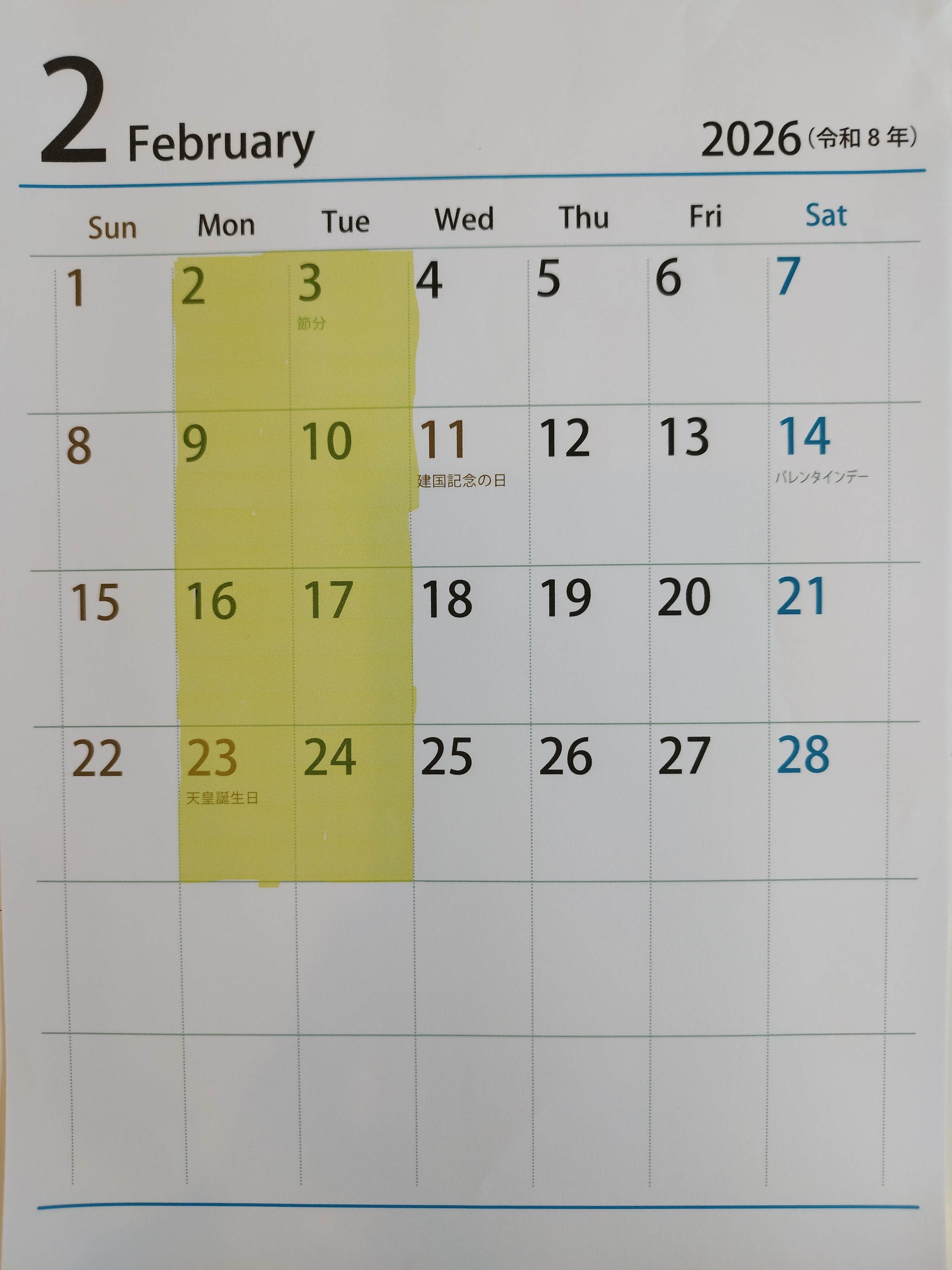 1日2日3日、5日6日、12日13日、19日20日、26日27日。